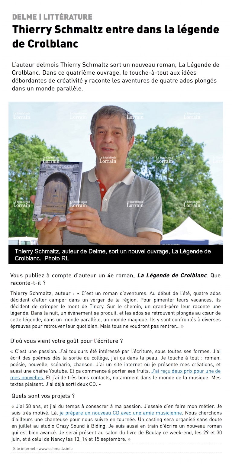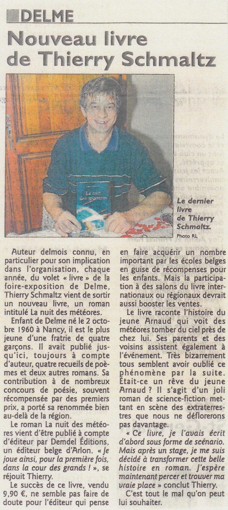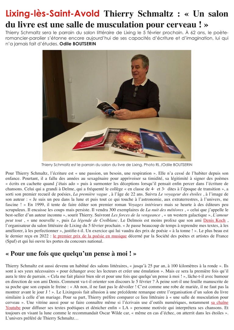 Ça me plait de savoir que Thierry Schmaltz poursuit encore et encore sa route, sa carrière d’auteur. Il sera d’ailleurs prochainement parrain d’un salon littéraire de Lixing-lès-Saint-Avold.
